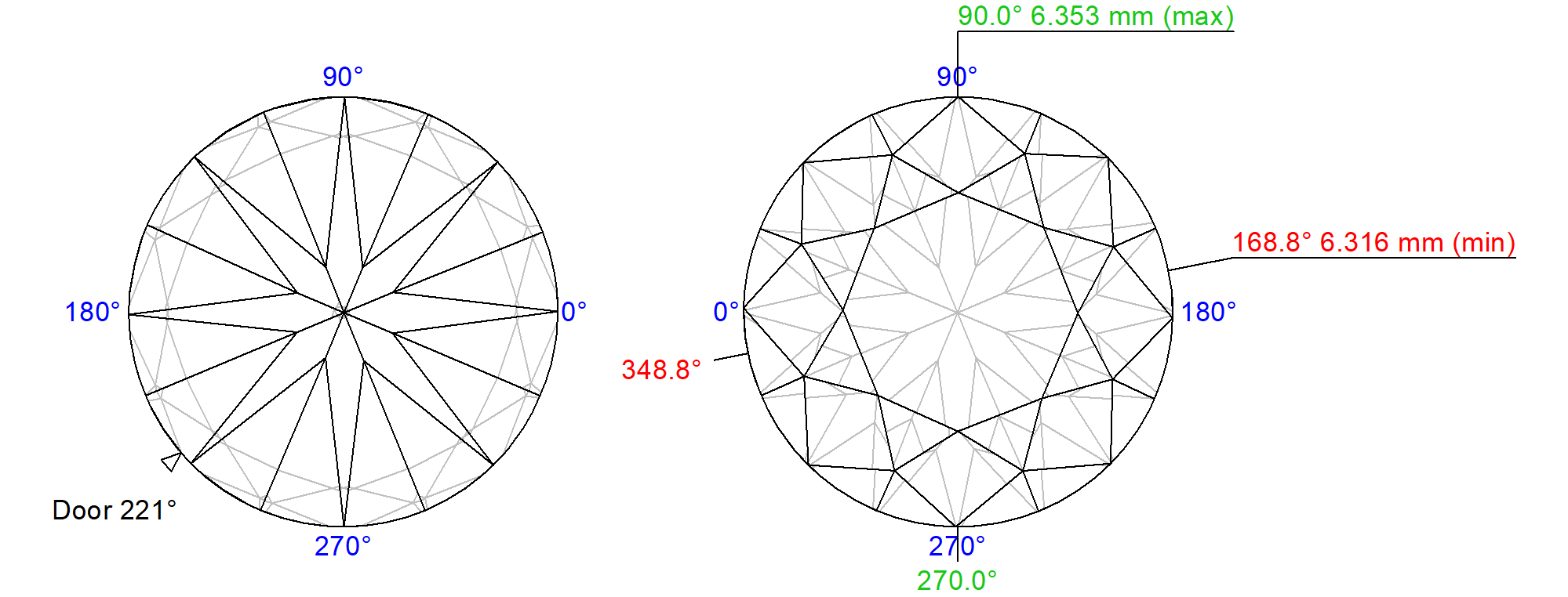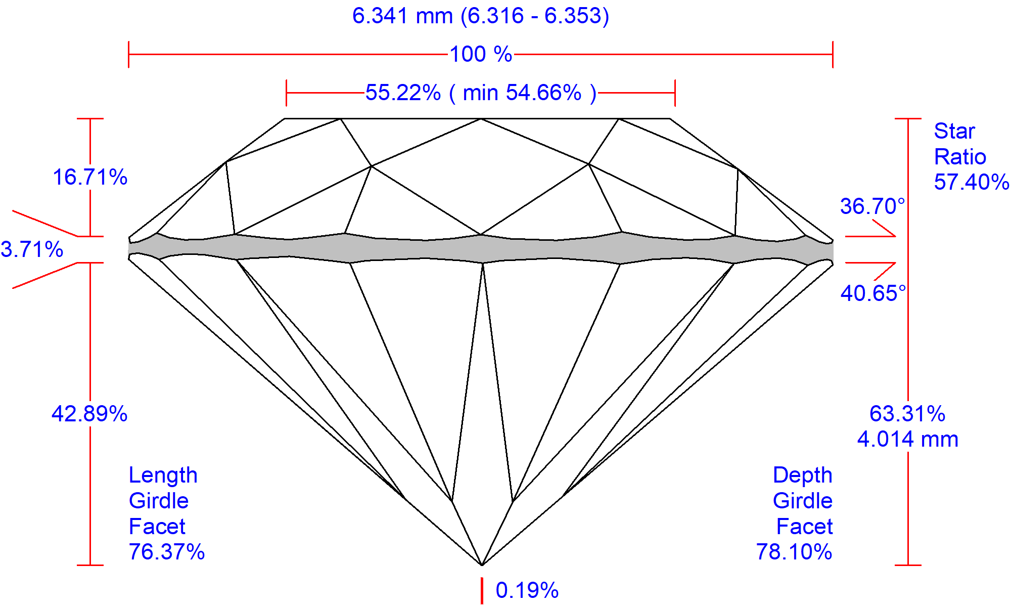 | Girdle to table-culet line offset | 0.68 %, 0.043 mm | |||||||||